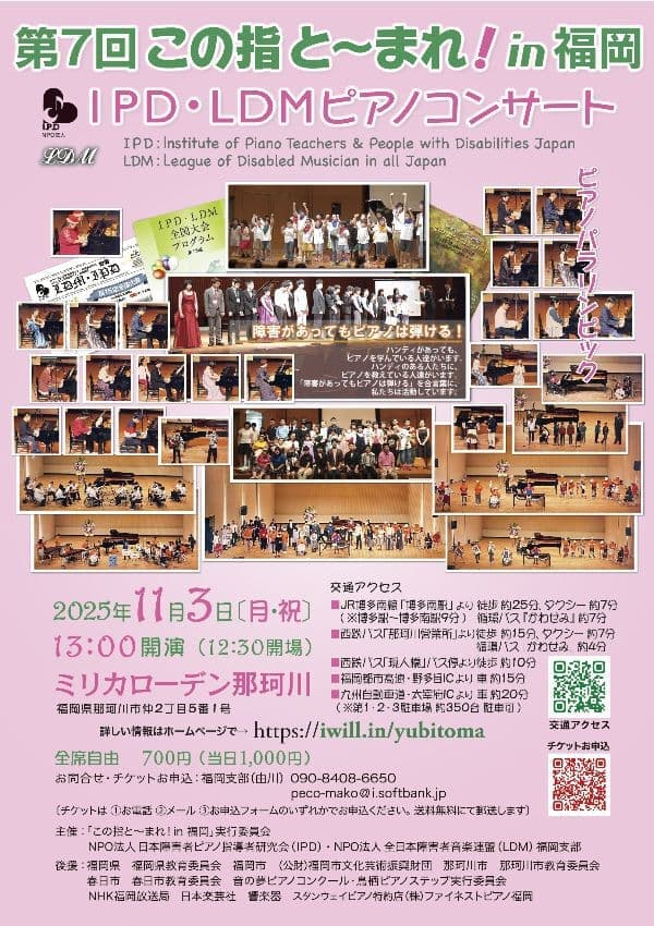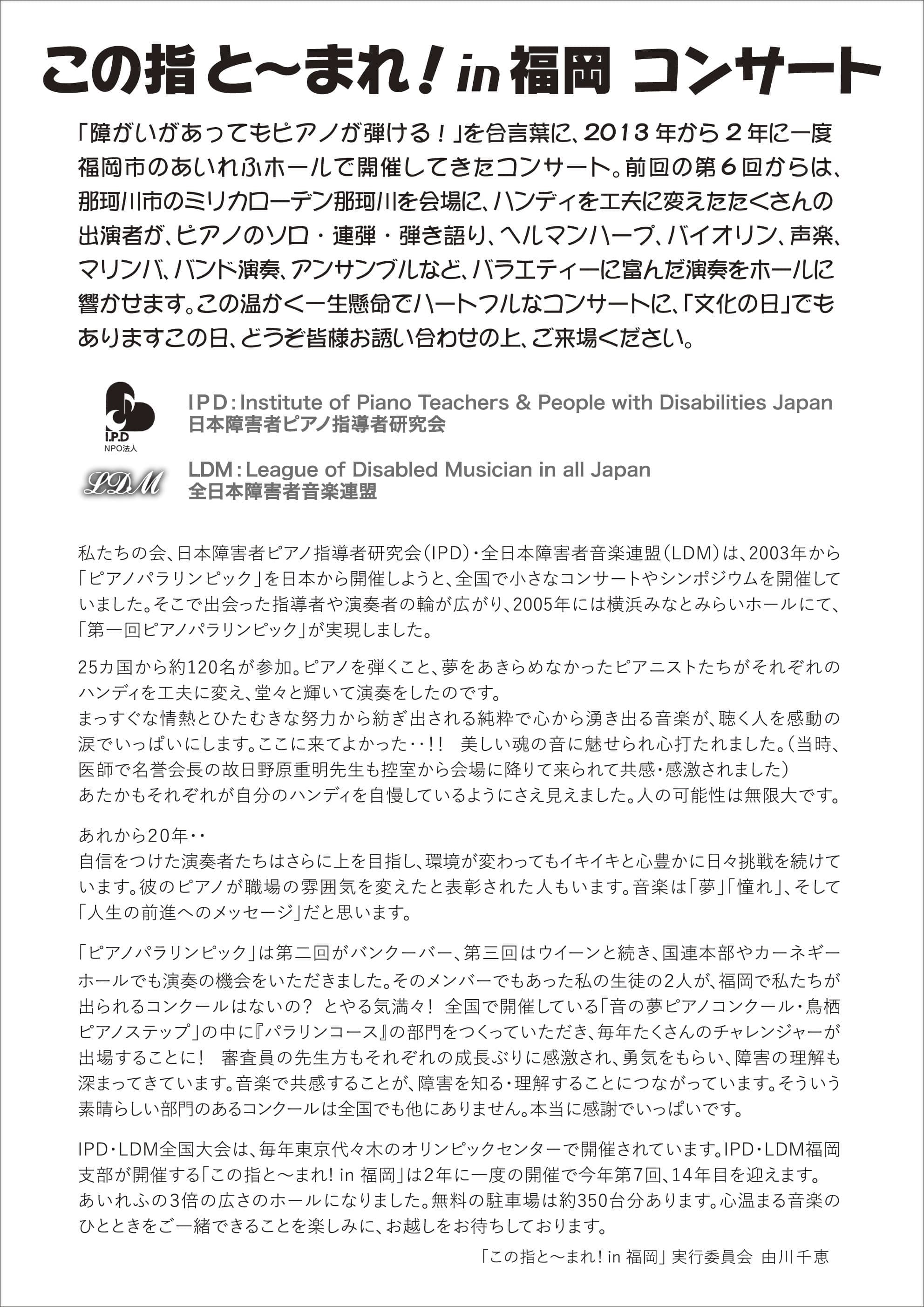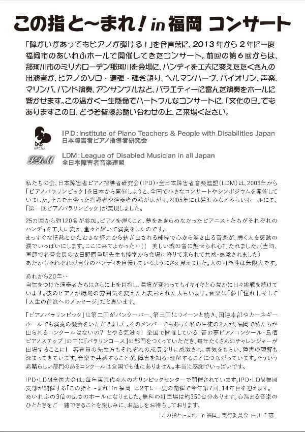 「障がいがあってもピアノが弾ける!」を合言葉に、2013年から2年に一度、福岡市のあいれふホールで開催してきたコンサート。今年第7回、14年目を迎えます。